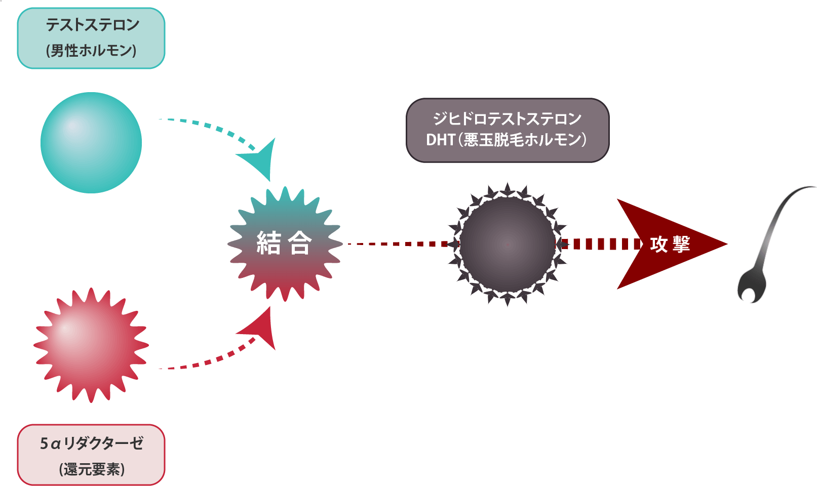 その中でもAGAの最も大きな要因は「男性ホルモン」の1つ「テストステロン」が『5αリダクターゼ』と結合して「ジヒドロテストステロン(DHT)」に変化して、毛髪を作る細胞(毛母細胞)の働きを低下させることが原因とされています。