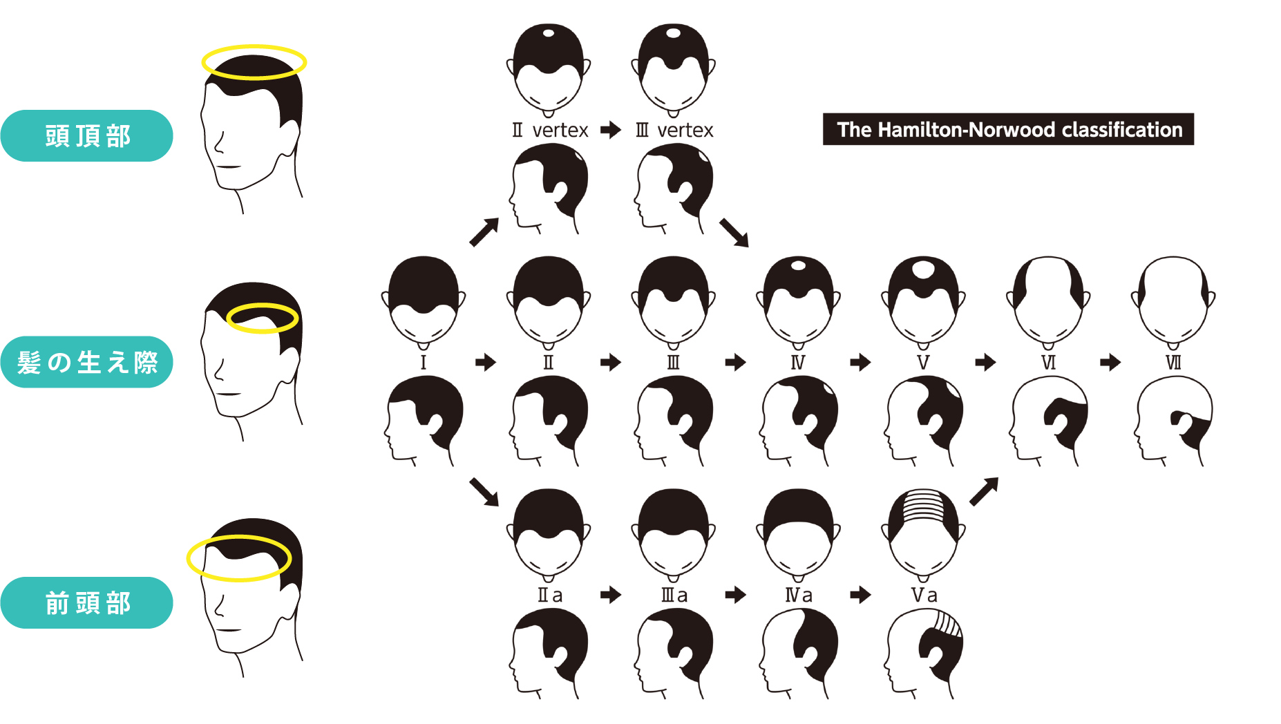 ハミルトン・ノーウッド分類とは、アメリカのハミルトン医師が、男性型脱毛の進行パターンを症状別に7つのステージに分類したものとなります。日本人に最も多いとされているのはVertex型という症状です。